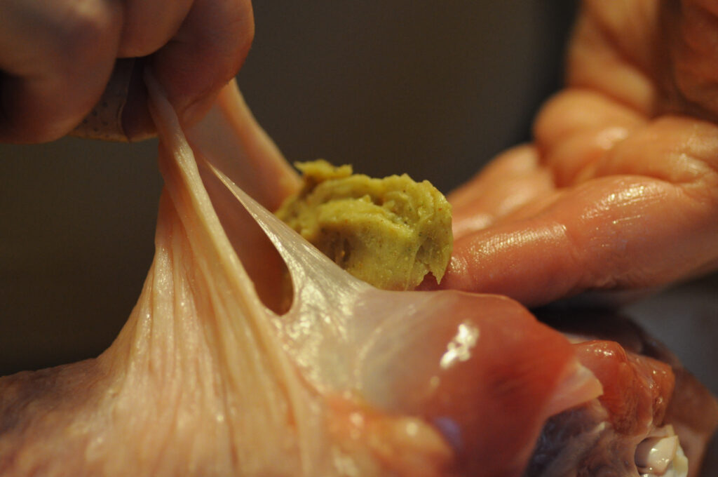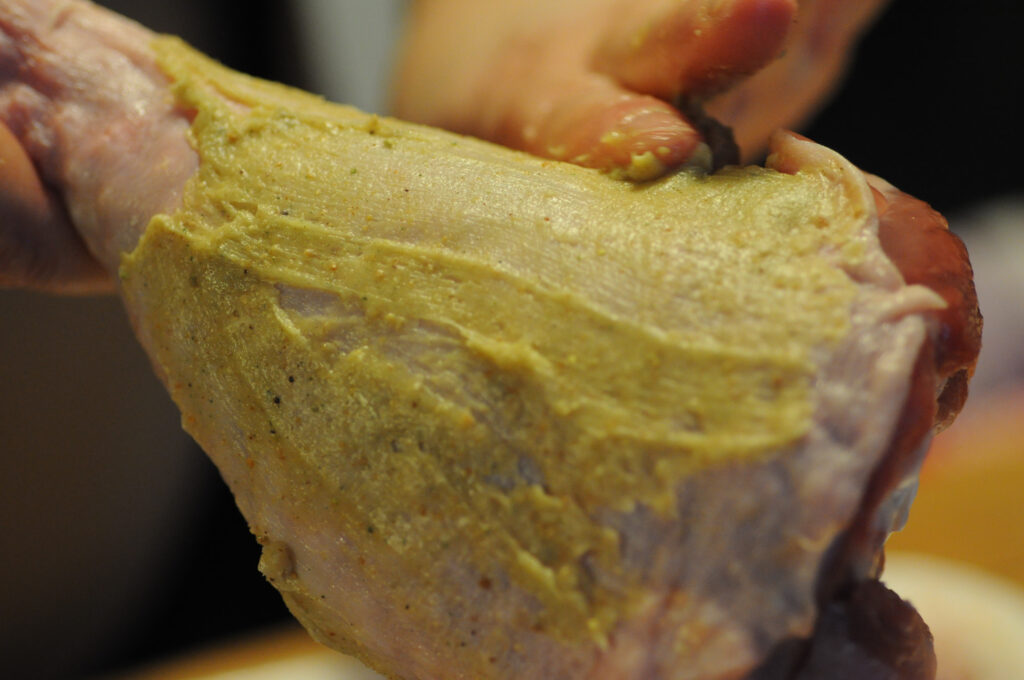 - Solleva la pelle della coscia di tacchino e spalma un quarto del burro, poi riposiziona la pelle per chiudere. Ripeti per la seconda coscia.