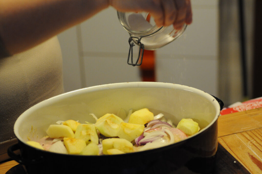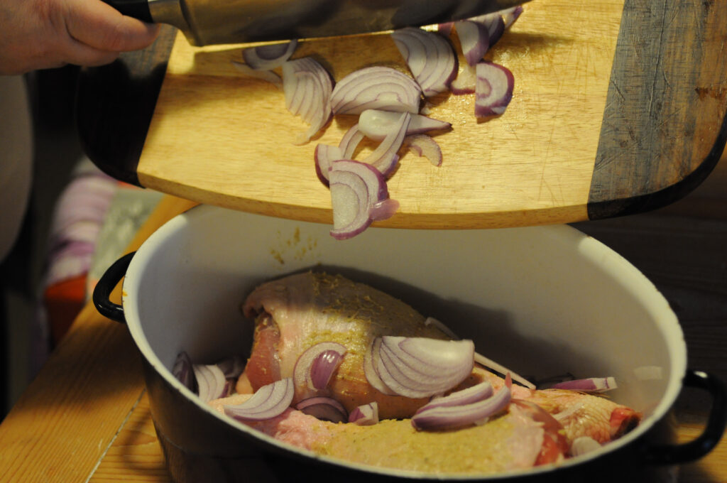 - Adagia le coscie in una pirofila, taglia a spicchi le cipolle e le mele e uniscile alla carne.